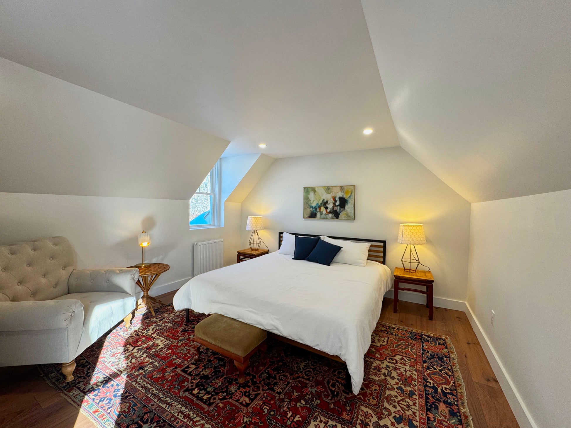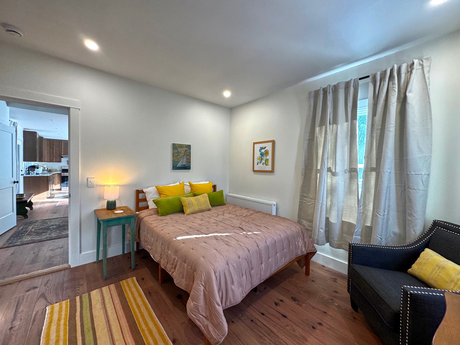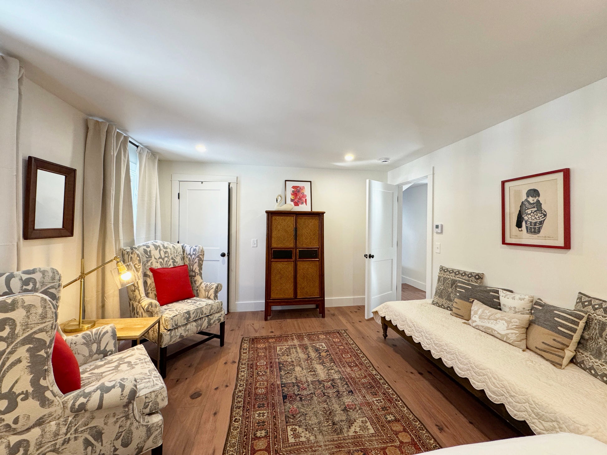 Layout: First Floor: Covered Entry; Stylish Living Room with flat screen TV; Open fully equipped Kitchen with new stainless steel appliances and bright Dining area with access to lovely outdoor rear lawn. Bedroom with Queen Bed and large closet; Full Bath with tub and shower. Second Floor: Bedroom with Queen Bed overlooking the lawn, with large closet. Oversized Bedroom with 2 Twin Beds, gorgeous daybed, and Sitting area; Full Bath with shower and tub; Laundry Area; Spacious Primary Bedroom with King Bed and open closet, overlooking the rear yard. Attached Garage may be partially available for guest storage use of small items, please inquire.